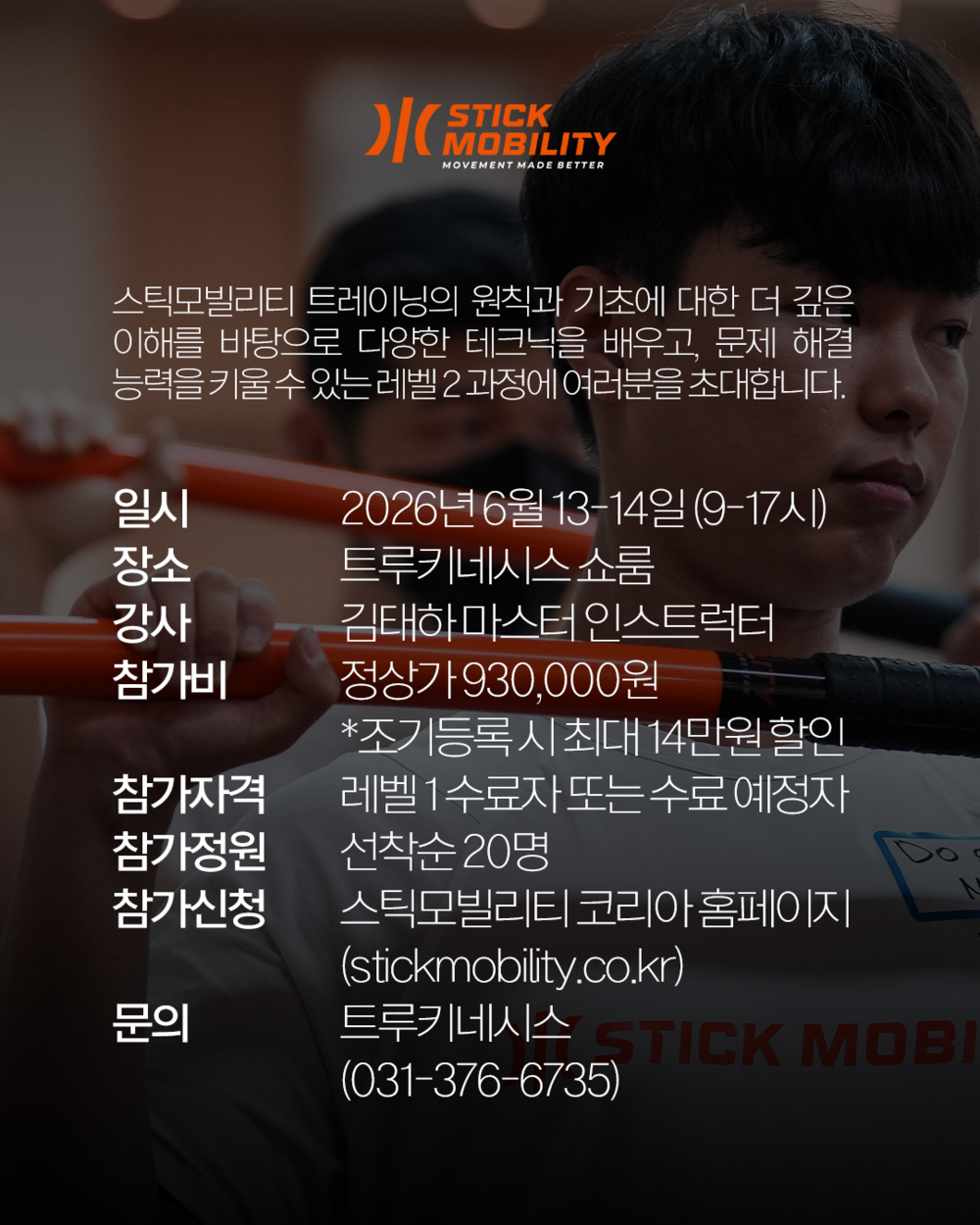 2024년 3월 이후, 2년 만의 레벨 2 인증 과정이 2026년 6월 13-14일 개최됩니다. 레벨 2 인증 과정을 통해 스틱모빌리티 훈련 테크닉을 심화하고, 문제 해결 능력을 키워 더 높은 수준의 전문가로 발돋움하세요.
